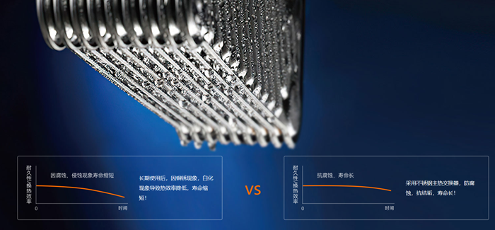 相反冷凝式壁挂炉主要采用不锈钢热交换器作为核心配件,不锈钢材质具有耐腐蚀的性能特点,有效防止水质二次污染,不易产生氧化物隔热层,长久保持高换热效率,同时因为不锈钢耐腐蚀性较强,使用寿命也相应增加,相同保养条件下,冷凝炉在使用寿命上是普通炉的两倍。