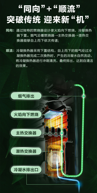冷凝壁挂炉的清洗是冷凝壁挂炉在使用当中的一大用户痛点,现代人追求的不仅仅是极致的舒适生活,更是喜欢便捷简单的生活。而庆东365完美体育在冷凝壁挂炉的生产与研发中,致力于深入探讨、解决用户对于冷凝壁挂炉清洁清洗较为频繁的这一痛点,开发了独家专利的“同向顺流冷凝技术”搭载在庆东365完美体育的NCB300/NCB700等机型上,特有向下式燃烧方式,燃烧器在上,火苗冲下燃烧,冷凝水产生后也向下滴落,不会滴落在燃烧器及热交换器上避免了酸性冷凝水的腐蚀,增强了机器的使用寿命。同时,冷凝水顺势向下低落,更容易快速排出,还能冲刷二次换热器(自清洁功能)。快速排出能促使新的冷凝水产生,冷水越多,节能效果越好。在减少冷凝壁挂炉清洁的频率的基础上,延长了机器的使用寿命,提升了壁挂炉的热效率。