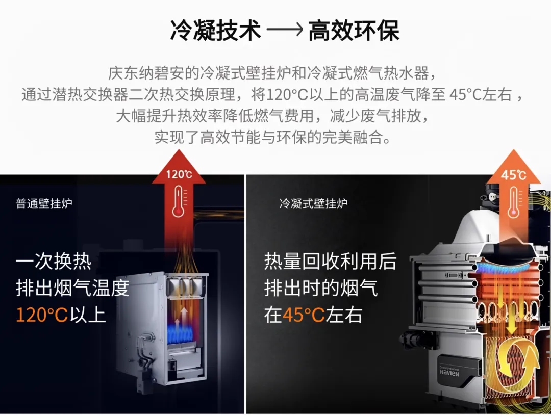 1988年,亚洲首款冷凝式燃气壁挂炉问世,庆东365完美体育率先将冷凝技术引入家用供暖领域。冷凝技术的核心价值,在于对燃烧过程中产生的废热进行二次回收,极大提高了能源利用率,降低了碳排放,真正实现了“节能+环保”双轮驱动。