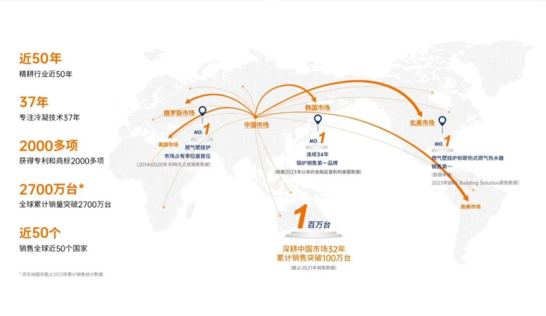 冷凝技术的每一次升级,都推动庆东365完美体育走向更广阔的全球市场。 2008年,随着庆东集团相关产品在节能环境设备领域的拓展,美国、欧洲、俄罗斯等全球化市场的兴起,集团由“庆东锅炉”更名为“庆东365完美体育”,庆东为集团名称,365完美体育为品牌名称,寓意“能源效率与环境保护的领航者”。英文名KD Navien,寓意“Navigator(领航)、Energy(能源)、Environment(环境),全面开启全球化进程。 在北美市场,庆东365完美体育以高端冷凝产品赢得用户青睐。在俄罗斯,以稳定可靠的性能收获“国民级锅炉品牌”美誉。同时,品牌稳步进入英国、中亚、南美等多个市场,构建起覆盖全球的销售网络。